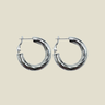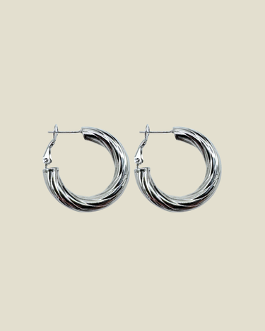 Een set zilverkleurige oorbellen met een verfijnde twist. Deze oorbellen hebben een doorsnede van 3 cm. Het elegante, gedraaide design geeft een moderne draai aan een klassiek model. Perfect om solo te dragen voor subtiele stijl of te combineren met andere oorbellen voor een gelaagde, speelse look.