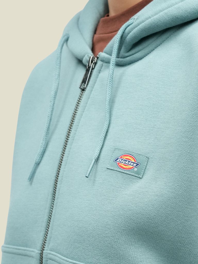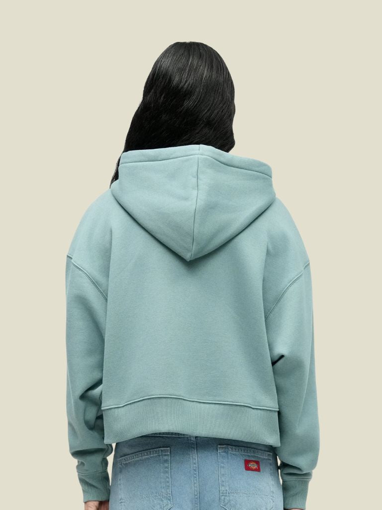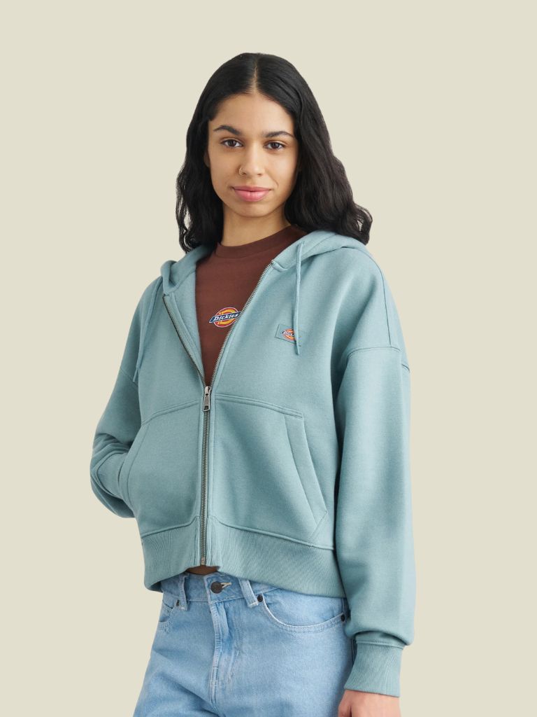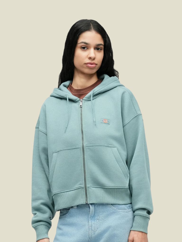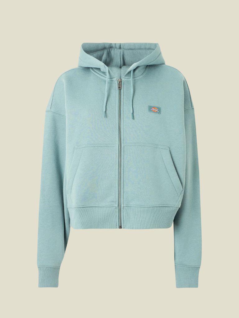 De Oakport Zip Hoodie van Dickies is een frisse take op een klassieker. De zeegroene Stormy Sea kleur geeft deze hoodie een moderne, cleane uitstraling, terwijl de boxy en cropped fit zorgt voor een eigentijdse twist. De rits maakt ‘m perfect om te layeren over een T-shirt of tanktop. Afgewerkt met een subtiel Dickies-logo voor die herkenbare workwear vibe.