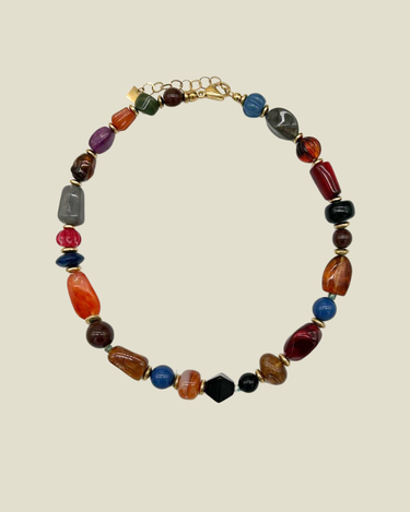 Een kleurrijke ketting met een mix van stenen in warme herfsttinten. Het speelse ontwerp geeft elke outfit een gezellige, natuurlijke uitstraling. Perfect om solo te dragen of te combineren met andere kettingen voor een gelaagde, bohemian look.