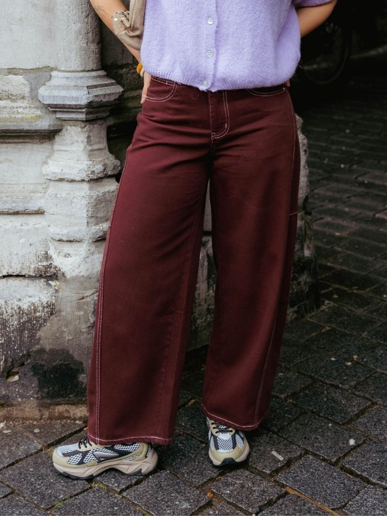 De Chloe Prune Pantalon is een moderne eyecatcher met een stoere twist. De contrasterende witte naden geven de broek een speelse, opvallende look, terwijl de barrel fit met wijde broekspijpen zorgt voor een relaxed, maar stijlvol silhouet. Gemaakt in een rijke donkerrode kleur die moeiteloos combineert met neutrale en felle kleuren.